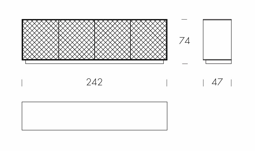 Luce komoda išsiskiria rafinuota lakuotos medienos konstrukcija ir veidrodinėmis durelėmis su elegantišku geometriniu raštu. Blizgus stiklas kuria šviesos atspindžių žaismą, suteikdamas interjerui charakterio ir lengvumo.