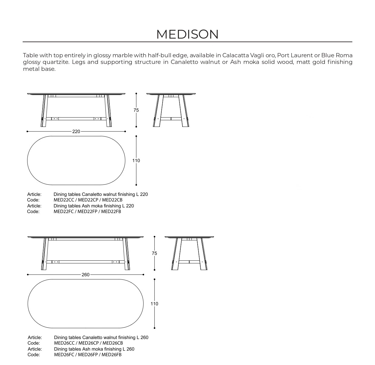 Medison stalas pagerbia marmuro prabangą, kurio eleganciją sustiprina ovali linija ir lengvas pusapvalis kraštas. Išskirtinės „BlackTie“ marmuro apdailos suteikia stalui skulptūrinio grožio, puikiai tinkančio tiek valgomojo, tiek darbo erdvėms. Matinio aukso kojelių akcentai pabrėžia subtilų stiliaus detalumą, o tvirta Canaletto riešuto ar masyvo uosio konstrukcija užtikrina patikimumą ir rafinuotą estetiką.
